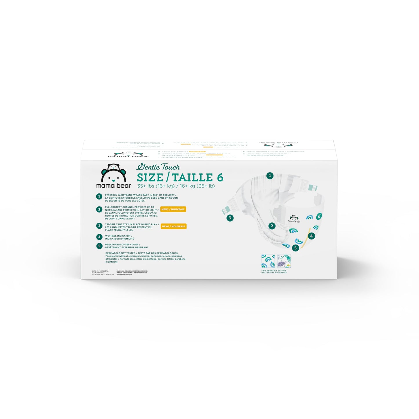 - IN THE BOX: Mama Bear Gentle Touch Diapers for babies 35+ pounds; size 6; (4 packs of 27 diapers each, 108 total)