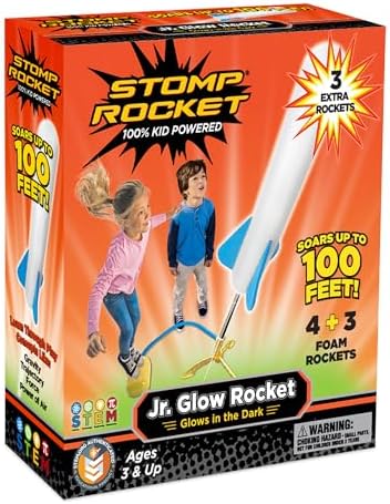 - RUN, JUMP, STOMP AND GLOW: Experience active fun, day and night, with Stomp Rocket’s Jr. Glow! Take turns launching glow-in-the-dark rockets with your friends and family. Includes 7 Jr. Glow Stomp Rockets, Launch Stand, Launch Pad with Air Hose. Recommended for ages 3 and up.
