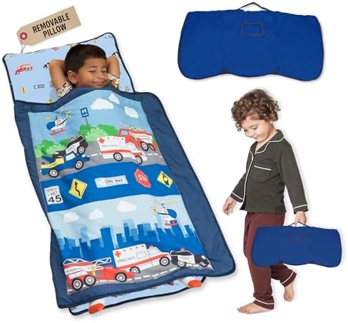 EVERYDAY KIDS Toddler Nap Mat with Removable Pillow -Fire Police Rescue- Carry Handle Fastening Straps Closure, Rollup Design, Soft Microfiber for Preschool, Daycare, Sleeping Bag -Ages 2-6 years
