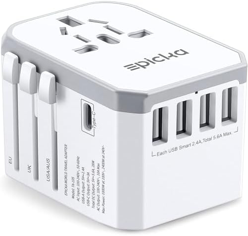 EPICKA Universal Travel Adapter, European Travel Plug Adapter - International Power Adapter Worldwide Charger with USB-C & 4 USB-A Ports, Travel Essentials for Italy, Japan, Europe, UK (TA-105, White)