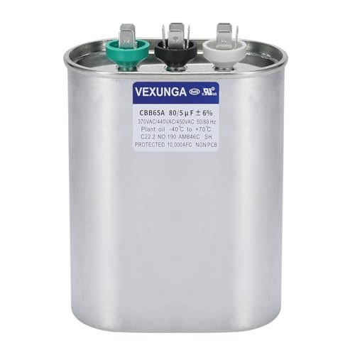 - VEXUNGA 80+5 uF ±6% 370/440/450 VAC CBB65 dual run start capacitor replacement for ALL 370 & 440 &450 Volt capacitors.