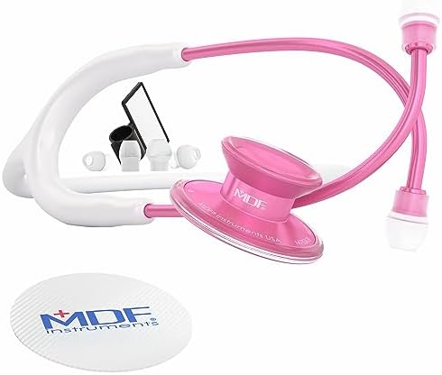 MDF Instruments, Acoustica Lightweight Stethoscope for Doctors, Nurses, Students, Home Health Use, Adult, Dual Head, White Tube, Pink Pinkore Chestpiece-Headset, MDF747XPPO29