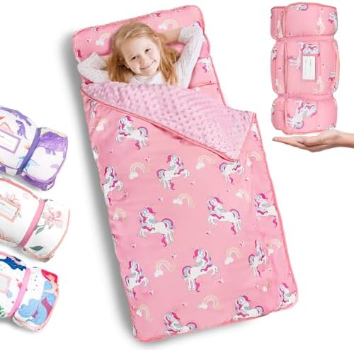 Primlect Thickened Toddler Nap Mat with Removable Pillow and Minky Blanket, Extra Large 55''x35'' Sleeping Bag, Washable, Roll up, Perfect for Daycare, Preschool, Kindergarten, Boys and Girls Unicorn