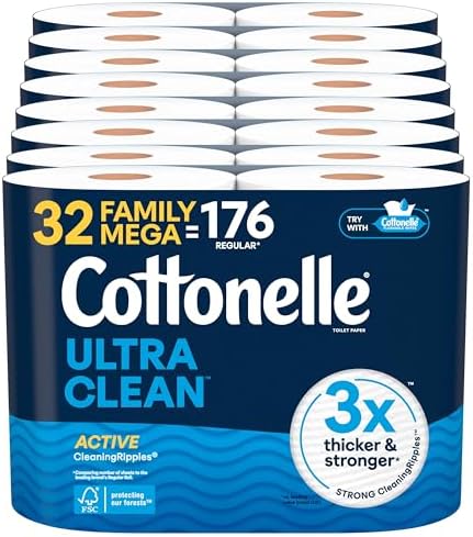 Cottonelle Ultra Clean Toilet Paper with Active CleaningRipples Texture, Strong Bath Tissue, 32 Family Mega Rolls = 176 Regular Rolls (8 Packs of 4)