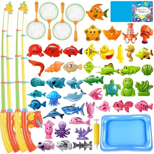 CozyBomB™ Magnetic Fishing Toys Game Set for Kids | Water Table Bathtub Kiddie Pool Party & Pole Rod Net, Plastic Floating Fish Toddler Color Ocean Sea Animals Birthday Age 3 4 5 6 Year
