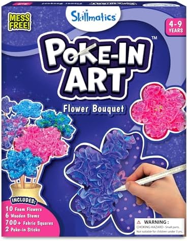 - POKE-IN ART ACTIVITY: This mess-free craft activity encourages creativity! Kids will make their own flower designs using fabric squares that are poked into foam to create petals and then mounted on wooden stems. Once complete, these beautiful DIY flowers can be arranged into a lovely bouquet.