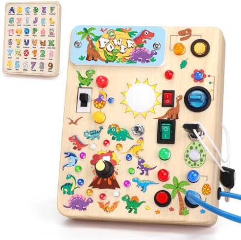 - Elaborate Design - This busy board is made especially for young children who like playing with switches and LED lights. On this busy board, there are 10 separate switches, and each switch relates to a different color or style of LED light. Each LED's brightness is set to be just right for the infant-not too bright, blinding, or dark to see well.A master switch is set up to turn off all LED lights with one click to avoid wasting power.