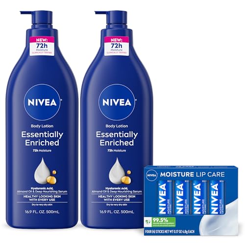 - SKIN CARE SET INCLUDES: Two 16.9 fluid ounce bottles of NIVEA Essentially Enriched Body Lotion and four 0.17 ounce NIVEA Moisture Lip Care Lip Balm Sticks