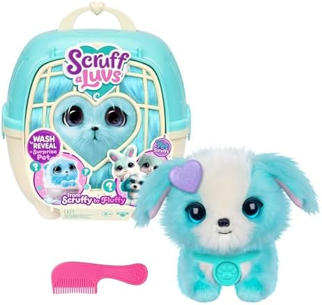 SCRUFFALUVS Pet Scruffs Blue - Mystery Plush Toy, 7.5" Tall - Wash to Reveal 1 of 3 Rescue Pets: Puppy, Bunny, or Kitty - Includes 8.7" Deluxe Pet Carrier - Styles May Vary