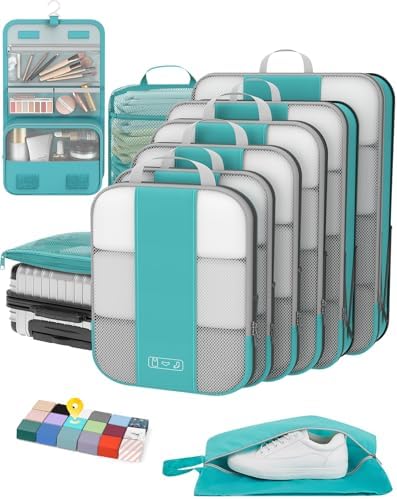 10 Set Compression Packing Cubes for Travel Essentials,Compressible Expandable Packing Cubes for Suitcase,OlarHike Luggage Organizer Bags for Travel,Handy Helper for Organizing Clothes(Blue Green)