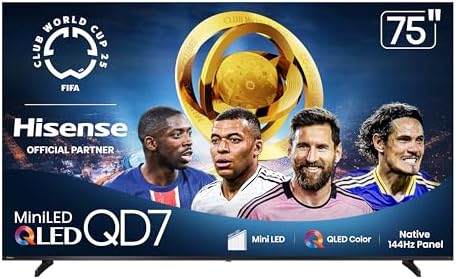 Hisense 75" Class QD7 Series Mini-LED 4K UHD Smart Fire TV (75QD7QF, 2025 Model) - QLED, Native 144hz, HDR10+, Dolby Vision, Dolby Atmos, Game Mode Pro, ALLM, Alexa Built in with Voice Remote, Black