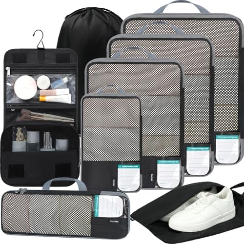 BAGAIL 4 Set/6 Set/8 Set Compression Packing Cubes Travel Accessories Expandable Packing Organizers (Half Mesh, 8-Jet Black)