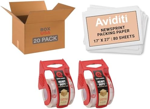 - GREAT VALUE: Contains 2 Heavy Duty 2in x 25yd Clear Packaging Tape Dispenser, 20 18x14x12" Medium Moving Boxes and 2 lb. (80 Sheets) of Newsprint Packing Paper